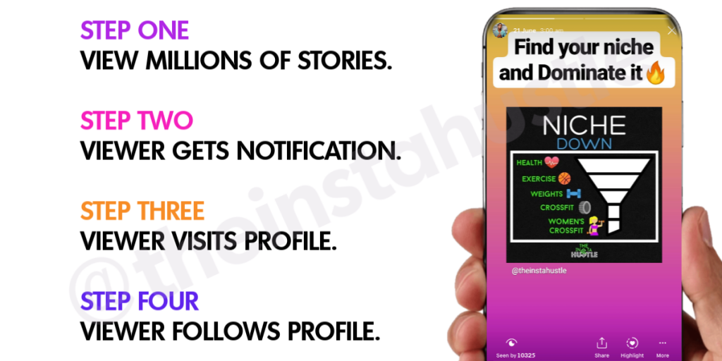 Some people on the platform like to check their story viewers list after posting. When they see a name they don’t recognize they visit the intruder’s profile. This method allows profile exposure through mass story viewing services, which ultimately leads to new followers.