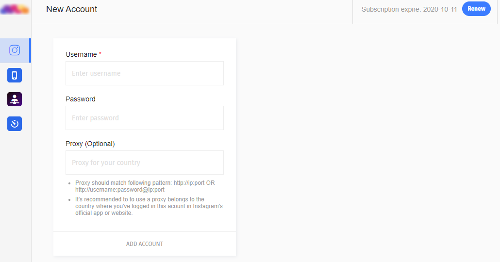 Log your account into the service. The service uses its own proxies, but if you want to be on the safer side and use your own proxy you can enter it in the field.