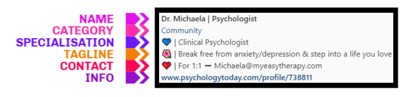 The Category section is a label you choose for your account based on the content. Given you are a therapist, a good one to choose is ‘mental health service’ but it’s up to you. In a similar vein, the first part of the bio should be your specialisation or official job title. The tagline is related to your work, so think of something creative that describes what you do but also what makes you different.